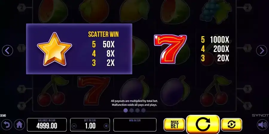 Добро пожаловать и вращайте барабаны, услышать звуки звона монет и картофельных чипсов, переворачивающихся на покерных столах. Ждите выигрышных комбинаций блестящего винограда, дыни, вишни всамп; семерки под неоновыми огнями наблюдают за знаками разброса звезд, которые будут поощрять вас большими выигрышами.vsnbsp;Все полезные и вкусные свежие фрукты вы найдете в игре, и эти плоды могут щедро вознаградить вас. Арбуз, апельсин, лимон, красный виноград, слива, вишня – что-то выбранное вами фрукт? Что касается фруктов, самые высококомпенсированные фрукты — арбуз и красный виноград (х100), хотя самое большое платное представление, когда вы смотрите на онлайн-игру, может быть семеркой (х1000).