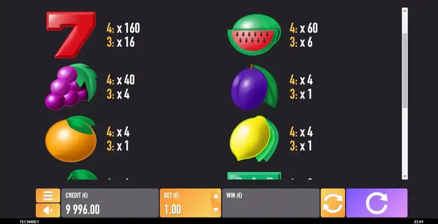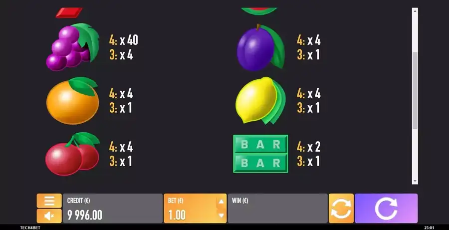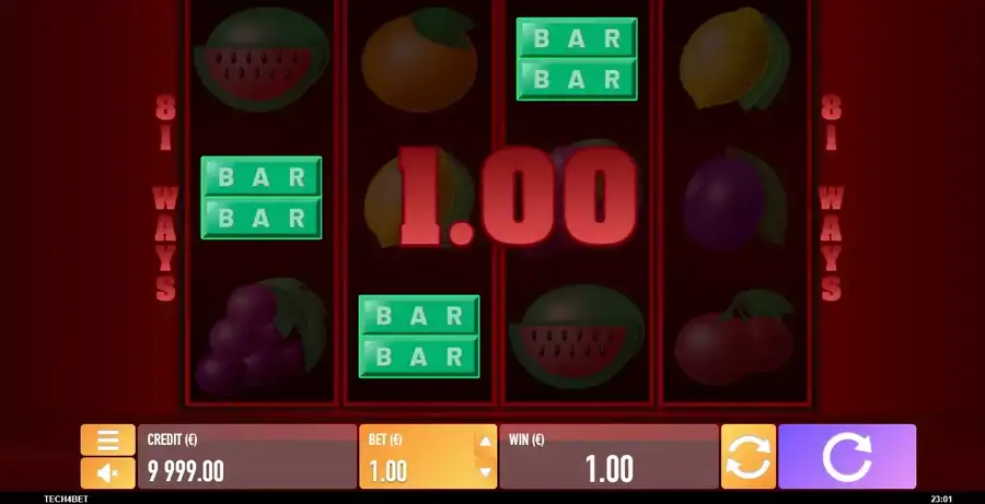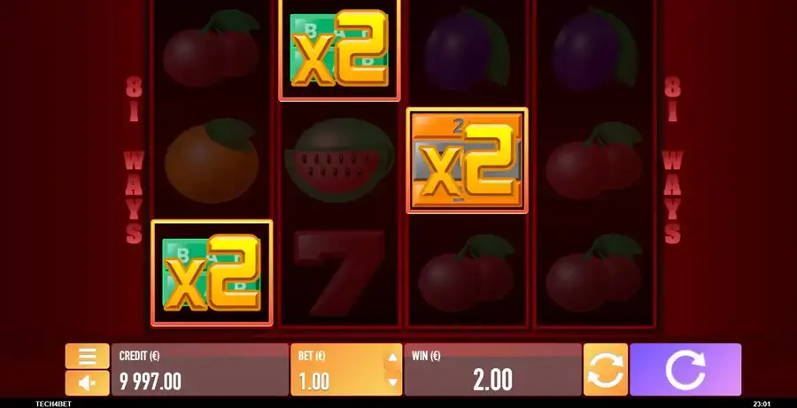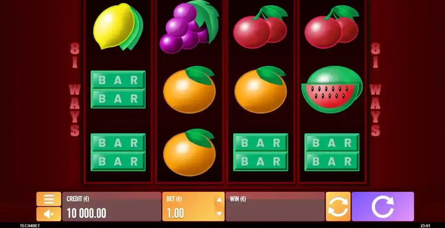 Slotcatalog представляет новый инновационный слот для видеоклипов от поставщика Tech4Bet., игра 81 Горячие методы. Слот снова на фруктовую тематику от этого поставщика., на этот раз слот получил размер поля 4 * 3 и 81 компенсированные линии. В игре нет множества функций, зато можно полностью погрузиться в процесс игры в классическом дизайне без лишних персонажей и фич, только ты и вся игра. Expression Wild умножает вашу прибыль, 1 символ умножает ваш выигрыш в два раза, 2 знаки умножаются 4 раз, и 3 сумасшедшие знаки умножают вашу прибыль 8 раз! Игра 81 Hot Methods адаптирован для мобильных телефонов и ПК.