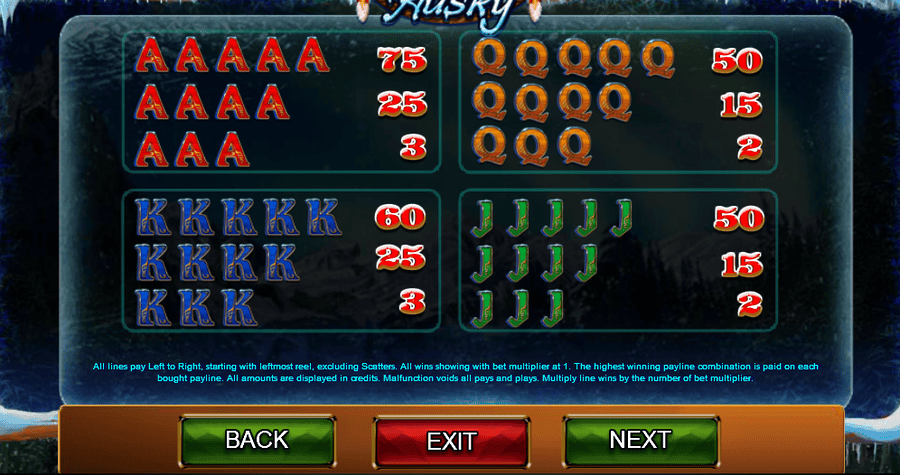 Кино-слот «Аляскинский хаски» от поставщика онлайн-игр Amaya — это 5*4 игра с 100 ставки. Слот имеет RTP = 95,43% и разницу в градусах MED.. Основные функции онлайн-игр, как правило,: Бесплатные спины, растущие символы, Джекпот, Знаки разброса, Случайные джокеры / альтернативные джокеры.