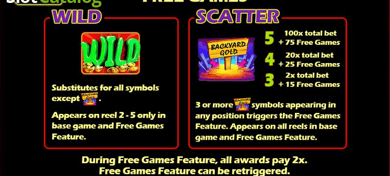 Backyard Gold — пятибарабанный автомат., 50 название линии выплат, которое помимо бесплатных вращений содержит дикие и сложенные знаки. Доступно на компьютере или мобильном телефоне, видеоигра основана на самой популярной китайской пословице с нахождением Жнаг Сан 300 Лян золота. Планируют сохранить свое серебро в безопасности, Чжан вырыл яму на заднем дворе и зарыл свой ресурс. В качестве дополнительной меры безопасности, Чжан размещает индикатор, когда вы смотрите на поверхность, решительно говоря, что «нет 300 Лян спрятан здесь!” Это постоянно прекрасно!