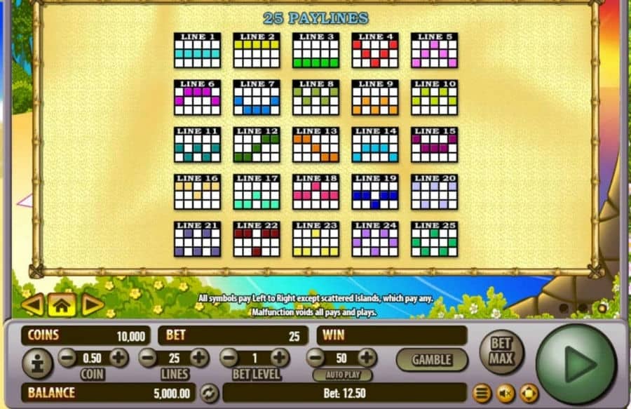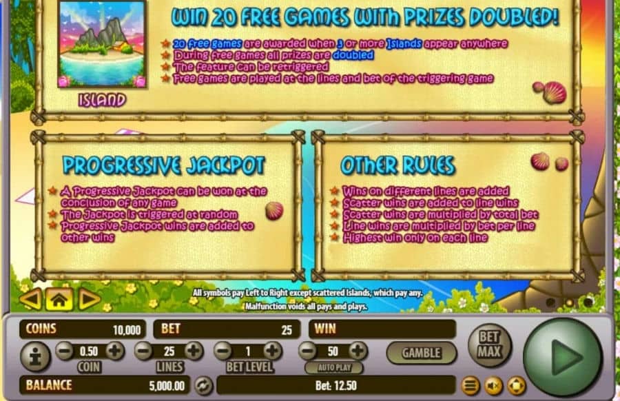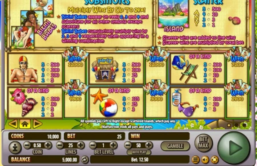 Видео-слот «Остров Бикини» от провайдера онлайн-игр Habanero Systems – это 5*3 онлайн игра с 25 ставки. Основные игровые функции: сумасшедший, Бесплатные спины, Множитель, Джекпот, Знаки разброса, Особенность: Символы замены, Риск (двойной) онлайн игра, поощрительные символы, Азартная игра.