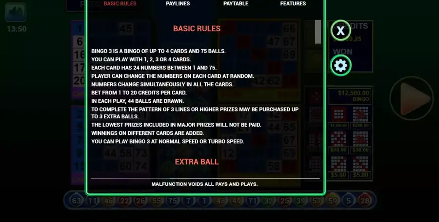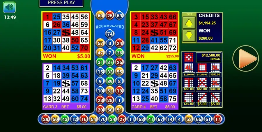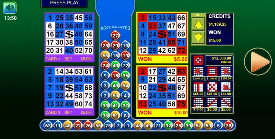 Бинго 3 это онлайн-игра в бинго на 75 шаров от дизайнера Vibra Gaming., в котором люди могут выиграть в 2500 раз больше. Вы можете легко играть с 4 карта в любое время, и забить бинго в самом первом 44 разыгранные шары присуждают современный джекпот!