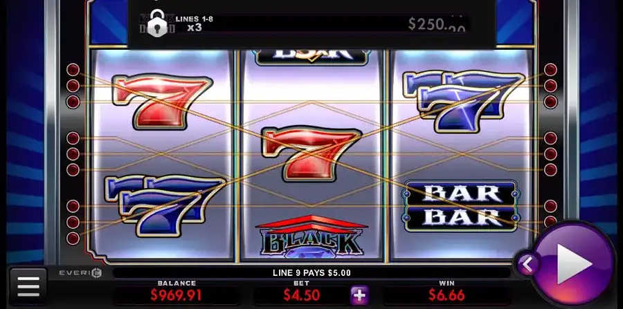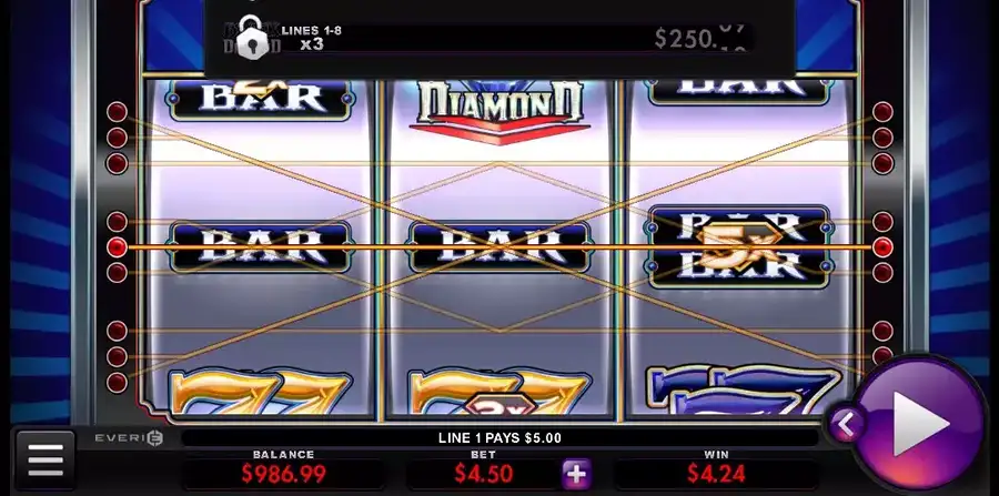 Ebony Diamond Deluxe — классический видео-слот от Everi с прогрессивными вызывающими символами., символы фиксированного множителя, и двойная функция Nudge. Графически, слот простой. Серый, синий и черный цвета, как правило, берутся за основу. По технической части, Black Diamond Deluxe поставляется с 3 катушки, 3 ряды, и 9 регулируемые линии выплат. Что касается суммы выплат, которую вы выбираете, ставки варьируются от 2.25 к 6.75 евро за спин. Игровая функциональность делает этот слот действительно мощным., в то же время Black Diamond Deluxe не может выглядеть очень сложным, который также понравится новичкам.