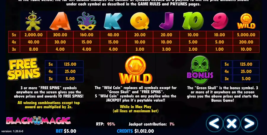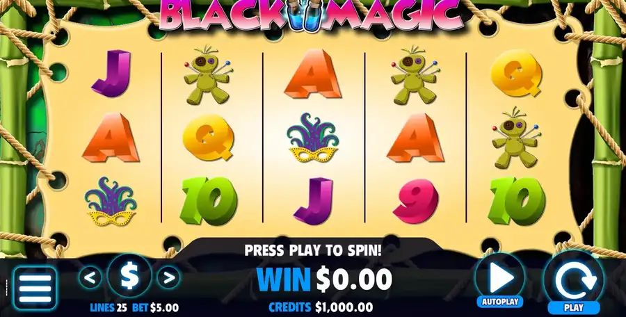 Для поклонников ужасающих и сверхъестественных слотов, Компания Jackpot Software выпустила слот под названием Black Magic., где вы откроете себя с волшебниками, практикующими черную тайну, также называется вуду. Теория видеоигр возвращается к игроку (RTP) является 95%. Черный секрет играется на 5×3 доска, где у вас есть 25 выигрышные линии. Использование правильного заклинания, вы можете активировать различные функции, такие как, например, бесплатные спины, Дикий, и бонусная игра с множителем до х200. Ставка начинается в $0.25 и вы можете ставить не более $5 за раунд. В игровой автомат можно играть как на мобильном, так и на настольном компьютере..