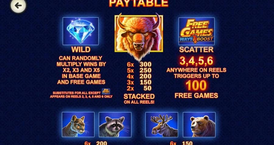 Вам потребуется как минимум 3 низкооплачиваемые символы в диапазоне, чтобы выиграть, хотя высокооплачиваемые тратят только 2 случаи точно такого же представления на одной строке, и самые большие награды даются за 6 комбинаций в своем роде. Выплаты немного урезаны в следующем разделе Buffalo Blitz., хотя, может не кардинально.