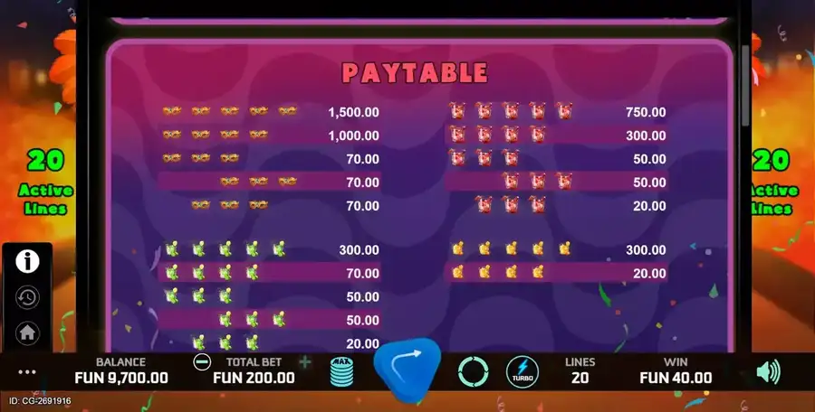 Любой, кто хотел бы развлечься со слотом Carnival Beauties от Caleta Gaming, сможет насладиться выдающейся программой и попытаться выиграть огромные. Фестиваль в Бразилии подарит вам незабываемые эмоции и потрясающий выигрыш в 1116 раз больше вашей ставки.. Слот может похвастаться классической механикой, который включает в себя 5 катушки и 20 энергичные линии. Нетрудно догадаться, что ключевыми символами в игровом автомате Carnival Beauties, скорее всего, будут маски., горячие танцоры, Бразильские напитки, наряду с другими тематическими символами. В этом слоте на самом деле есть несколько бонусных игр, а также жесткий и быстрый джекпот.. Можно сыграть в бесплатную демо-версию Carnival Beauties прямо здесь, в Slotcatalog..