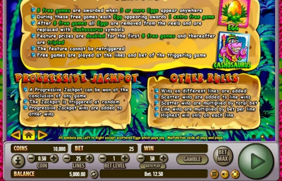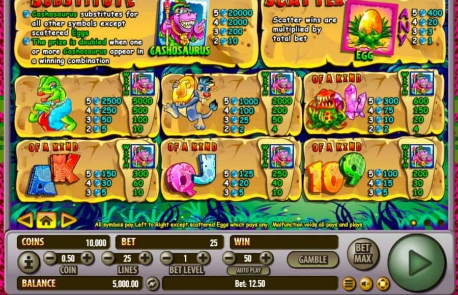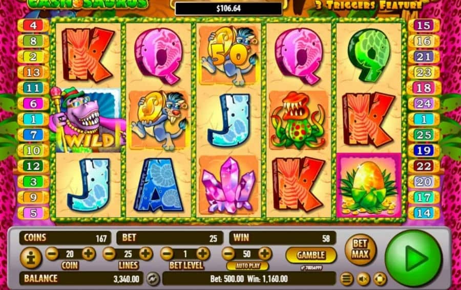 Видео-слот «Cashosaurus» от игрового провайдера Habanero Systems — это 5*3 онлайн игра с 25 ставки. Основные особенности игры: Дикий, Бесплатные спины, Множитель, Джекпот, Символы разброса, Особенность: Символы замены, Опасность (Двойной) онлайн игра, добавлены бонусные знаки, Множитель бесплатных вращений, Азартная игра.