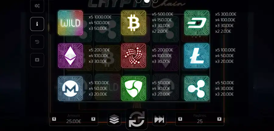 CryptoChain — это интернет-слот от поставщика Superlotto, впечатленный трендом криптовалюты.. Визуальные эффекты в этой онлайн-игре со слотами, как правило, уникальны, вам нужно включить возможности барабанов с различными знаками, похожими на картофельные чипсы., и фоновое изображение, где вы можете видеть серверы, небоскребы и сетка. Крипточейн имеет 5 катушки и 25 линии выплат. Теперь общие особенности игры 8 стандартные символы. Многие из этих знаков вызваны логотипами известных криптовалют, включая биткойн., лайткоин, Догикойн, и Эфириум. Есть только 1 специальный символ в этой игре – дикий знак на радужном жетоне. Сумасшедший символ заменяет все символы, чтобы помочь людям составлять выигрышные комбинации.. Общий, вас ждет простой игровой автомат с интересной тематикой.