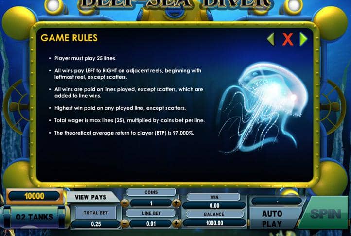 Этот 25 линия, 5 онлайн-игра reel предлагает свежий, невиданное ранее устройство для сбора резервуаров O2, которое позволяет игрокам персонализировать и активировать одну из трех различных функций бесплатных вращений, посвященных погружению, с использованием резервуаров O2, полученных во время обычной игры.. Наслаждайтесь так, как вы хотите, когда захочешь в глубоководном дайвере! Игроки могут решить расслабиться и сыграть в красочное Reef Dive., захватывающее погружение на затонувшие корабли и/или любопытное глубоководное погружение и, с функциональным программным обеспечением, может точно определить, сколько спинов, несомненно, будет сыграно и какие улучшения будут добавлены. Без сомнения, вам нужно погрузиться глубоко, чтобы выиграть по-крупному.! В Reef Dive Feature выберите до пятидесяти бесплатных вращений и множителей до x20.. Внутри Wreck Dive Feature выберите от пятидесяти бесплатных вращений или более до десяти Random Wilds, которые будут произвольно защищать экран, поворачивая соответствующие символы Wild.. В Deep Dive Feature выберите до пятнадцати бесплатных вращений со случайными заблокированными джокерами и множителями до x20.. Когда символ Wild находится на экране дисплея, он остается заблокированным до тех пор, пока функция не будет завершена..