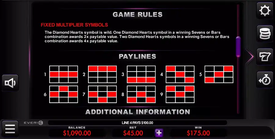 Everi продолжает серию классических игровых автоматов. На этот раз получили развернутые Diamond Hearts на веб-слоте.. Как правило, слоты от Everi использования 3 игровые барабаны, быстрые изображения, и множество игровых функций. Знаки, касающиеся онлайн-игры, стали простыми и удобными в обычаях компании., заинтересует как новичка, так и профессионального игрока. Люди могут делать ставки от 0.9 центов столько, сколько $450 за спин. Вы можете попробовать этот слот на реальные или виртуальные деньги. (Демонстрационный режим).