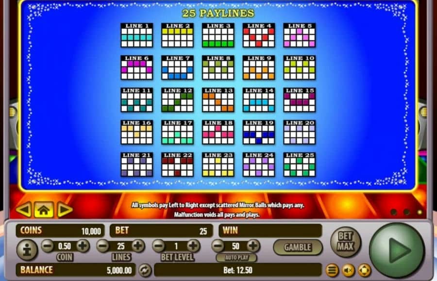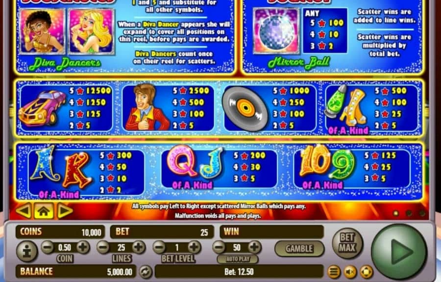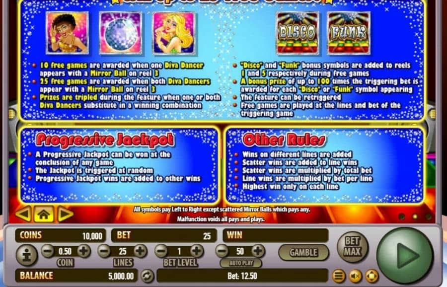 Видео-слот «Disco Funk» от поставщика онлайн-игр Habanero Systems — это 5*3 игра с 25 ставки. Основные особенности игры, как правило,: сумасшедший, Бесплатные спины, Множитель, Джекпот, Знаки разброса, Особенность: Символы замены, Риск (двойной) игра, добавлены бонусные символы, Множитель бесплатных вращений, Азартная игра.