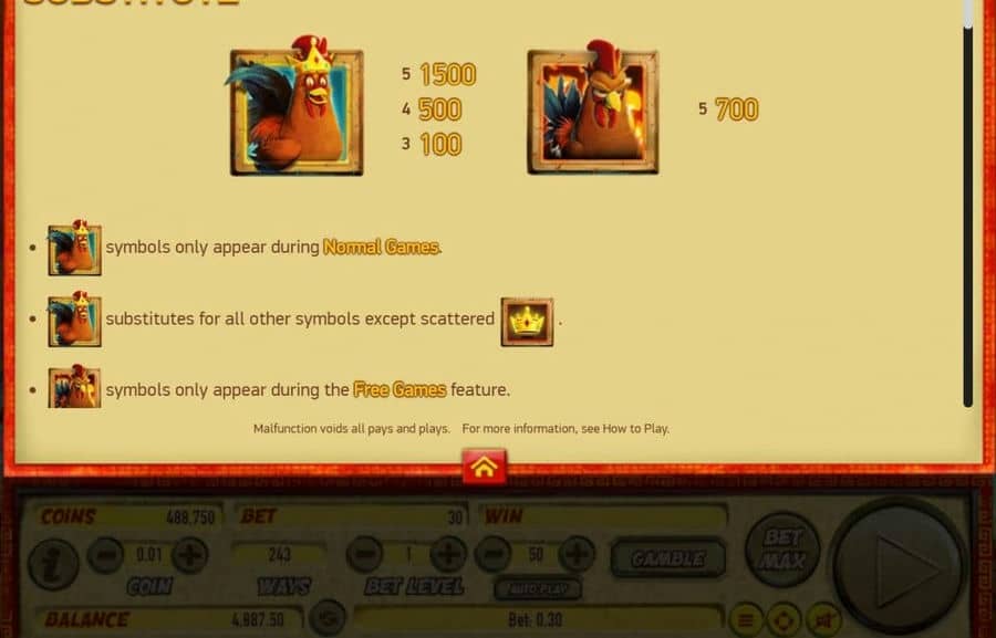 В китайской легенде о плаче петуха фигурирует многоножка., Дракон плюс Огненный Петух. Получите большой усилитель, если он загорится! Он может распределить оставшиеся символы джокера или соответствующие, вверх или вниз – в зависимости от того, что им нравится.
