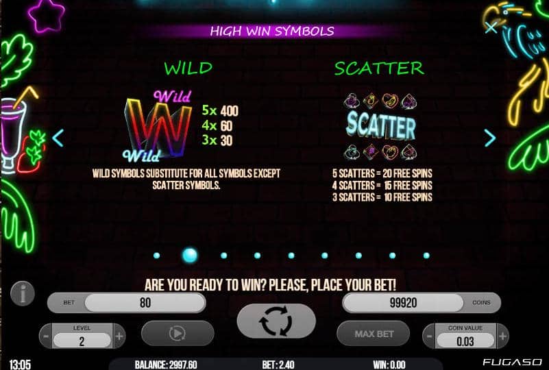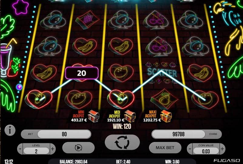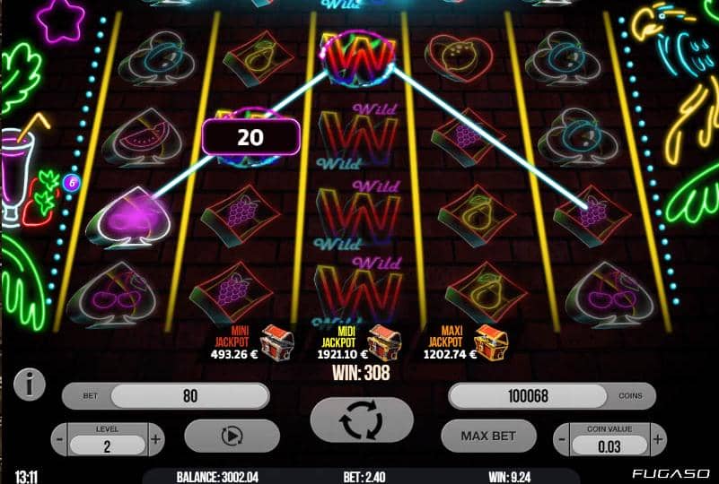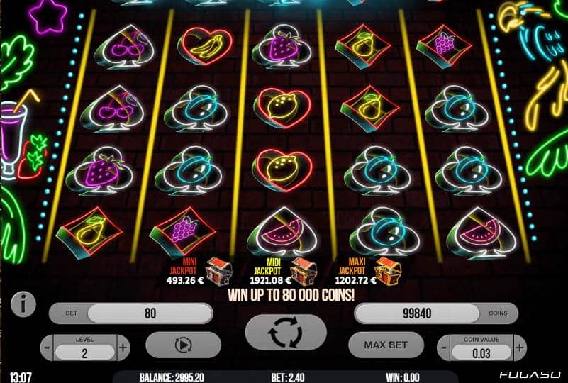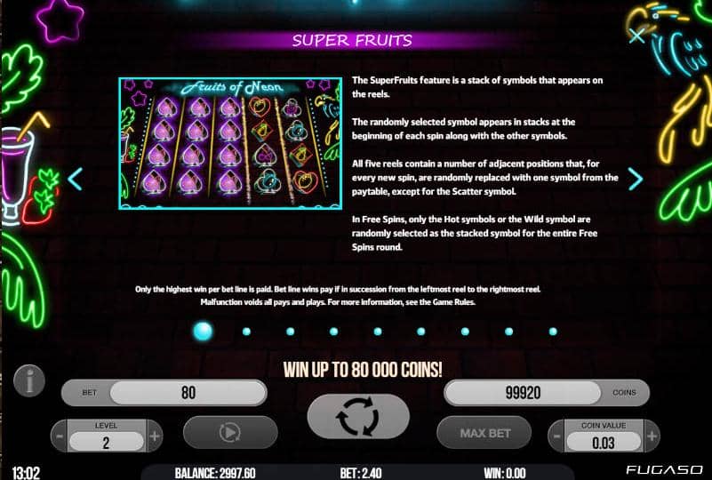Видео-слот Fruits of Neon от поставщика онлайн-игр Fugaso — это 5*4 онлайн игра с 40 ставки. Слот на самом деле имеет RTP = 91,09% и MED.? разница суммы. Основные особенности игры: Дикий, Бесплатные спины, Джекпот, Знаки разброса, Случайные дополнительные знаки.
