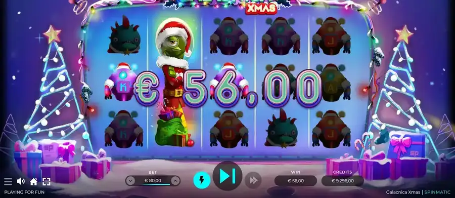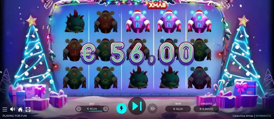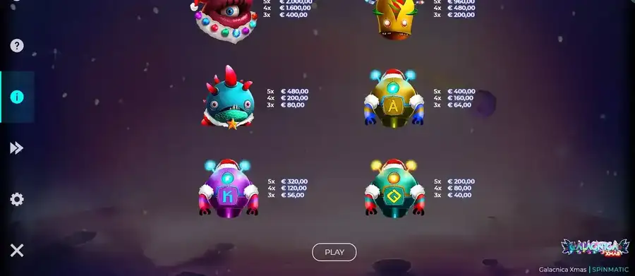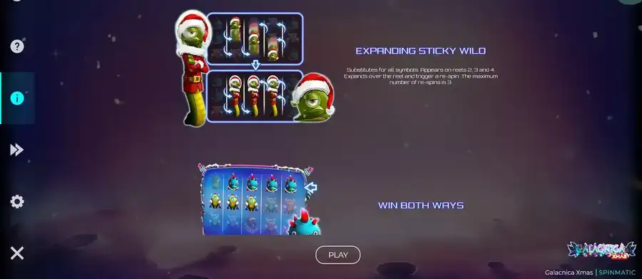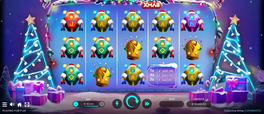 Galacnica Xmas — игровой автомат с глупой рождественской тематикой от Spinmatic.. На пяти барабанах, люди не могут видеть Санту или волшебного оленя, как и многие новогодние слоты. Символы состоят из роботов и различных зверей в рождественских шапках.. В видеоигре действительно впечатляющие фотографии и отличная рождественская мелодия.. По технической стороне, слот состоит из пяти барабанов, 3 ряды, и 10 фиксированные линии выплат. Общие функции игры растут Sticky Wild и выигрывают в обоих средствах. Теоретический возврат к игроку в этой игре 97.01%.