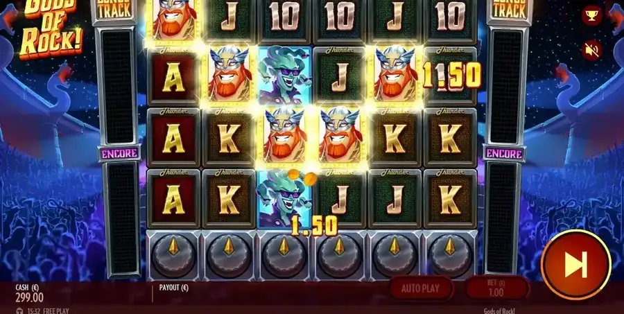 Вы запускаете В Gods of Rock добавлен бонусный раунд в любое время ты собираешь 55+ взрывающиеся символы в одной акробатической последовательности. Это награды 8 бесплатные вращения для начинающих, и множители барабанов, как правило, переносятся из базовой онлайн-игры.. The Множители барабанов никогда не сбрасываются между последовательностями вращений например, когда вы смотрите на базовую онлайн-игру, однако, и заполнение аналогичного счетчика добавленных бонусов без сброса +3 дополнительные спины к твоему счету.