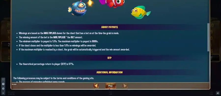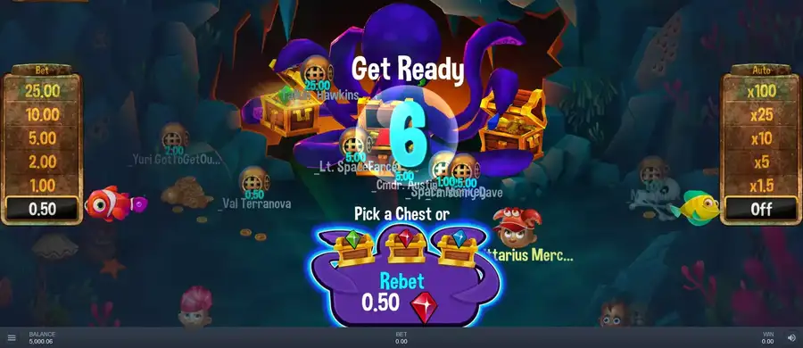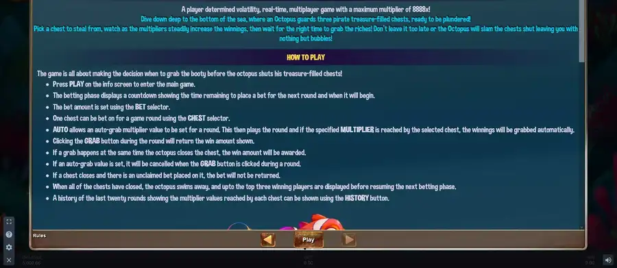 Недавно, игры с Crash Mechanic становятся все более привлекательными. Поэтому студия FunFair приняла решение разработать аналогичный слот.. Новая видеоигра Get Yer Booty! наполнен мотивом подводного мира и выглядит эффектно. Теоретический возврат к игроку (RTP) из-за этой игры 97%. Ключевой задачей будет быстро принять решение и схватить жертву раньше осьминога.. Множитель растет каждую секунду. Используйте свой импульс, чтобы получить прибыль до того, как ее заберет осьминог..
