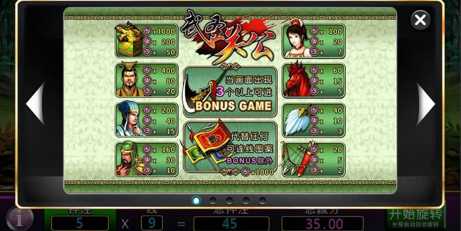 Кино-слот «Guang Gong» от поставщика игр Dream Tech — это 5*3 игра с 9 ставки. Основные особенности онлайн-игры:: Дикий, поощрительная игра, поощрительные знаки.