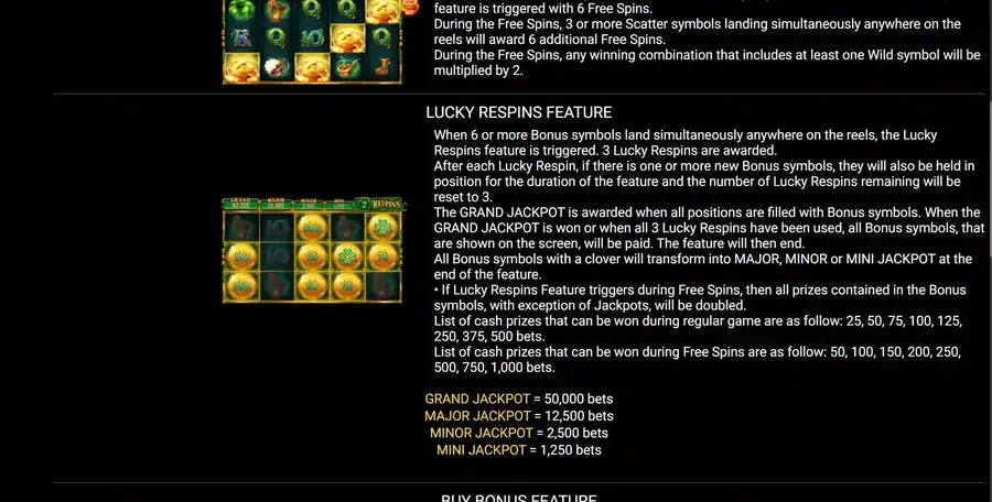 Leprechauns Coins — еще один видео-слот о лепреконах от Platipus. Действие видеоигры происходит на 5 Икс 3 игровое поле и оно имеет 243 как победить. Минимальная ставка всего € 0.25 за спин, и вы поставите максимальную ставку в € 50 за спин. Лепрекон — это дикий символ, который заменяет другие при формировании выигрышных комбинаций.. Горшок с золотом стал скаттер-выражением, это не только вызывает бесплатные вращения, но и дает отличные множители. В игре есть специальные бонусные знаки, которые запускают функцию удачных респинов.. Все бонусные символы с клевером изменятся на ЗНАЧИТЕЛЬНЫЕ., НЕЗНАЧИТЕЛЬНЫЙ, или МИНИ-ДЖЕКПОТ по завершении акции. Вы можете легко играть в Leprechauns Coins на любом устройстве с подключением к Интернету..