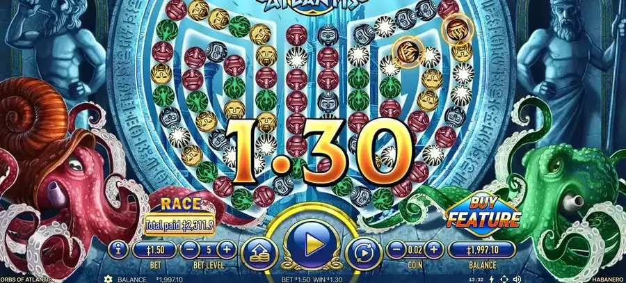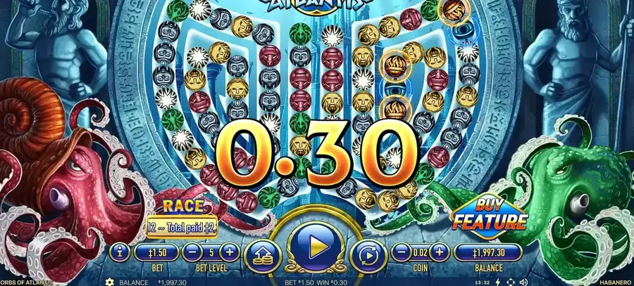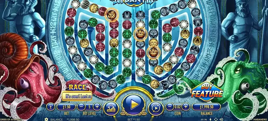 Тематически, вы посетите мифический город Атлантиду, а это значит, что вам придется уйти под воду. Визуальные эффекты отличный, а игровое поле окружено двумя анимированными осьминогами., which is a nice detail that makes the slot feel alive at all times. It’s a real feast for the eyes, and we have a lot of praise for what the designers managed to create here!