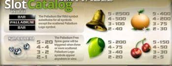 Palladium — пятибарабанный, 30-линейный игровой автомат с функцией «Palladium совершенно бесплатно Spins Game», который присуждает бесплатные вращения и множитель бесплатных вращений. «Игра бесплатных вращений Palladium» предоставляется, когда 3 или, возможно, в поле зрения появится больше символов логотипа Scattered Palladium Logo.