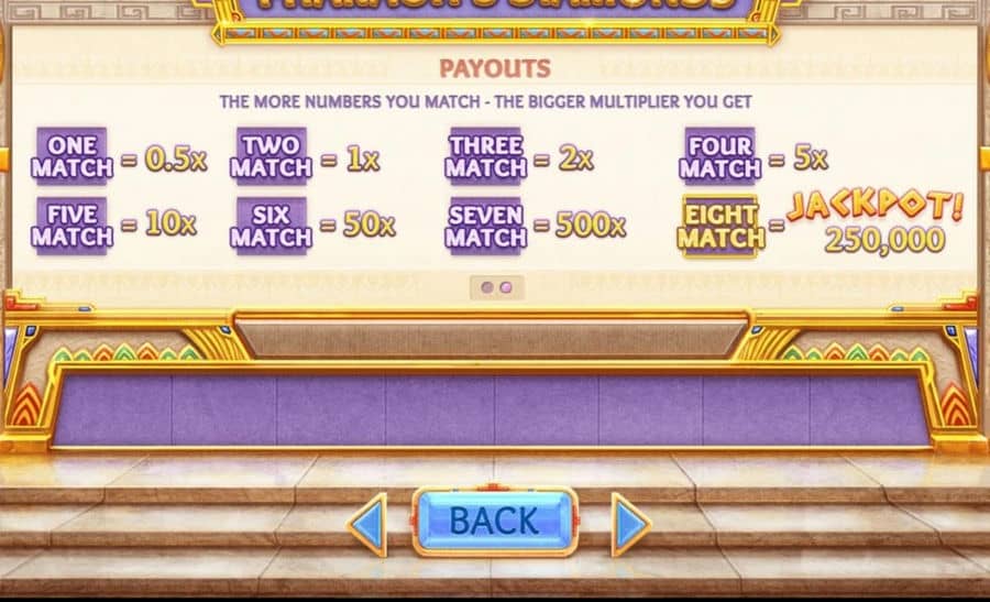Видео-слот «Pharaoh’s Diamonds» от поставщика онлайн-игр Cayetano Gaming — это 8*8 игра с 1 ставки. Слот на самом деле имеет RTP = 95% и MED.? разница уровней. Основные функции онлайн-игр, как правило,: Множитель, Джекпот.