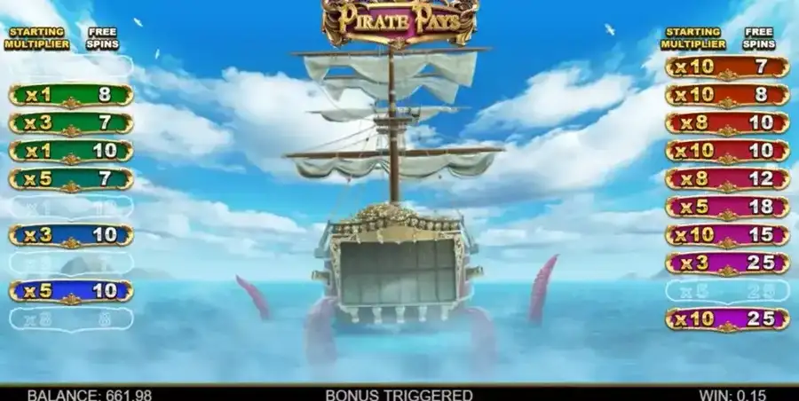 Если вы запустили улучшенный дополнительный бонусный раунд с помощью Megascatter на барабане 6, эквивалентная предварительная игра Kraken разыгрывается. Главное отличие заключается в том, что 10 результаты самого низкого уровня обычно исключаются заранее.