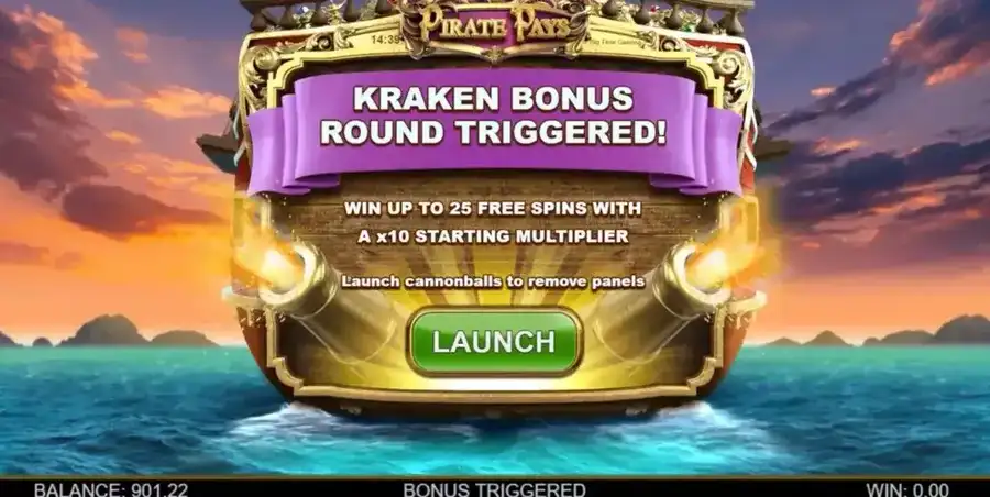 Предварительная бонусная игра «Сделка» или «Маленькая сделка» воспроизводится на новом экране, в котором пиратский корабль стреляет из пушек постепенно плюс случайно удалить 20 разные результаты. Они состоят из нескольких вращений в сочетании со стартовым множителем.. Идеальный результат 25 бесплатные вращения с x10 начальный множитель, в то время как абсолютный худший результат 6 бесплатные вращения с х1 стартовый множитель.