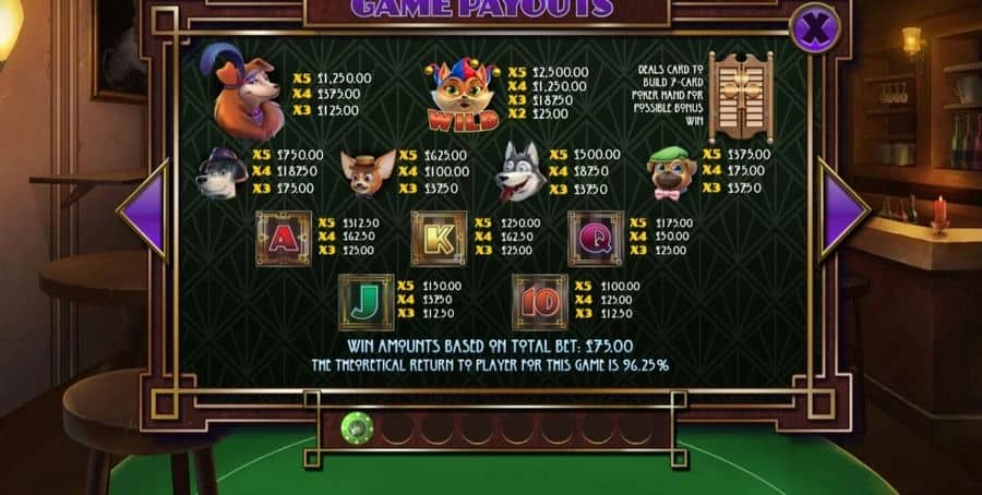 Пробраться в самую горячую спикизи в городе!вснбсп; Присоединяйтесь к шумной команде псов, которые хотят хорошо провести время и еще немного поцарапать.!вснбсп; На создание этой онлайн-игры 1930-х годов вас вдохновили популярные картины с красочными персонажами, которые помогут вам пройти через это.vsnbsp; Дилер (бульдог) ваш самый близкий друг, хотя иногда он может украсть у вас дополнительную карту, чтобы помочь вам выиграть!вснбсп; вснбсп;Исключительно уникальная функция, которую мы называем раздачей дилера, — это механика сбора, когда вы создаете обычную покерную комбинацию, которая vsnbsp;определяет ваши бонусные выплаты.