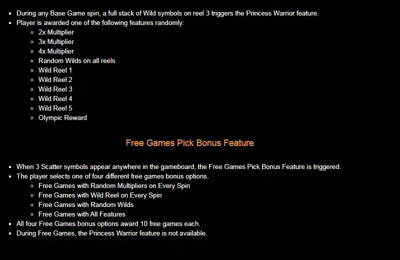 Сражайтесь вместе с принцессой за огромные богатства в онлайн-слоте Princess Warrior от RTG. В этом игровом автомате пять барабанов и 40 выигрышные линии. Слот оснащен захватывающим дизайном, полностью передающим окружение.. Среди игровых символов много принцесс и воинских качеств.. Большой слот волатильности включает в себя множество дополнительных функций, включая множители., Дикие земли, расширенный джекпот, и совершенно бесплатные поощрения спинов. Слот доступен не только на стационарных компьютерах, но и на современных смартфонах и планшетах.
