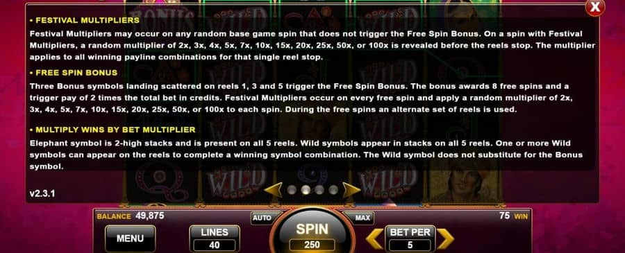 Волнение фестивальных множителей требует, чтобы люди аплодировали, поскольку случайный множитель, равный 100X, раскрывается перед остановкой барабанов.. Если на барабанах выпадают три бонусных знака 1, 3, или 5, люди получают 8 Бесплатные спины и триггерная выплата в 2 раза больше полной ставки.. Фестивальные множители также могут появляться во время каждого бесплатного вращения., предлагая игрокам возможность зарабатывать гораздо больше выигрышей!