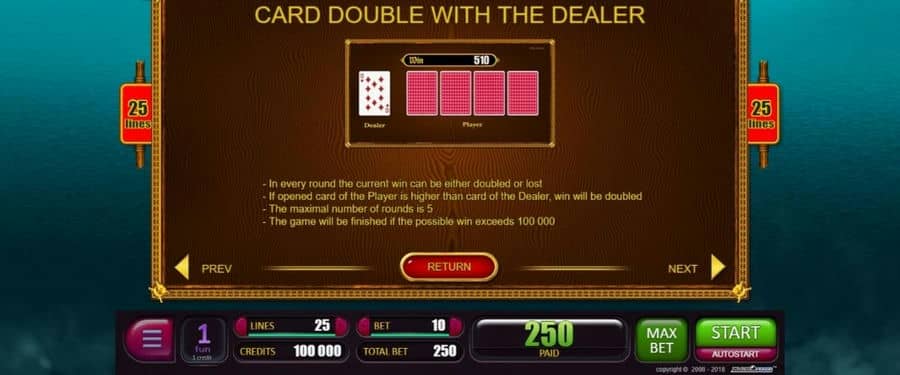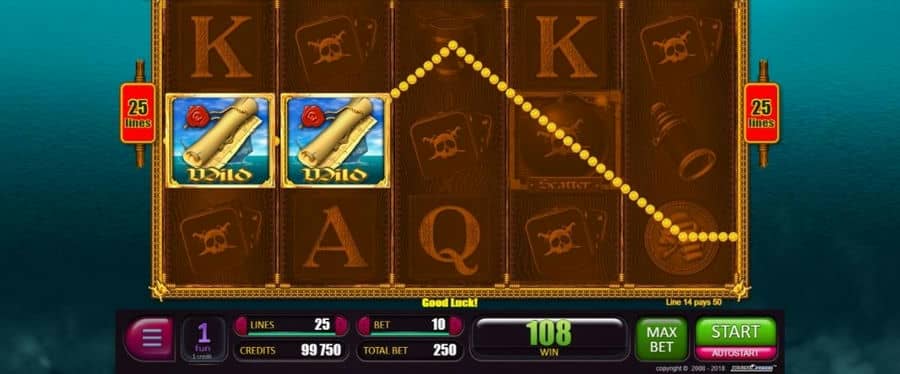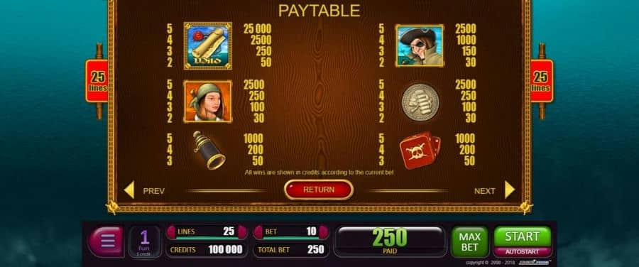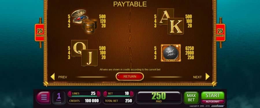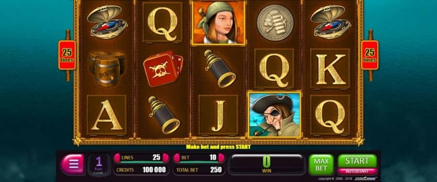 Классический видео-слот с пиратским дизайном; Три плюс скаттер-символа запускают бесплатные игры.; Повторное вращение барабана, когда 2 появляются знаки разброса; Значок «Пистолет» появился в триггере бесплатных игр “Решающий выстрел” бонус; к 100 закрытые бесплатные игры.
