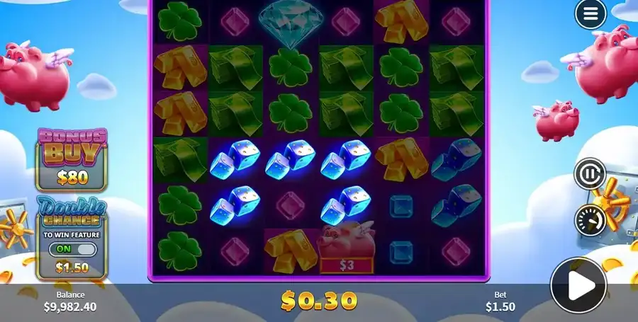 Ты можешь найти 6 знаки оплаты всего в Sky Piggies, и таблица выплат довольно большая, так как вы найдете разные выплаты в зависимости от размера фактического кластера. В любом случае, три низких предложения игры показывают синие драгоценные камни, фиолетовые сокровища, и четырехлистный клевер. Высокая оплата, в то же время, функция игральная кость, банкноты, и золотые таверны.