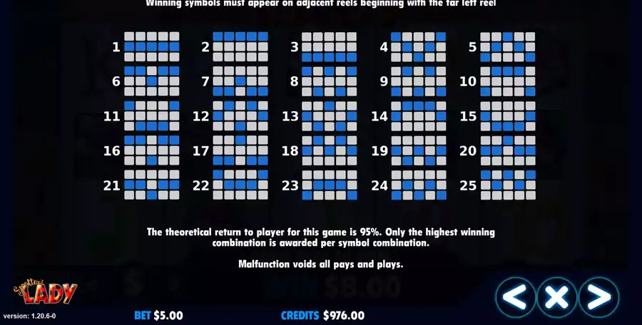 Spotted Lady — слот-вредитель от Jackpot Software.. Рисованная графика в мультяшном стиле выглядит очень особенно. Видеоигра происходит на обычных пяти барабанах с тремя рядами символов.. Вся прибыль создается из трех знаков для 25 фиксированные линии выплат. Игровые ставки и доля отдачи игрокам не на высоте. Слот Spotted woman отлично подходит для лоуроллеров.. Ты можешь найти 8 обычные знаки и 3 уникальные признаки в замеченной женщине. К специальным символам относятся: