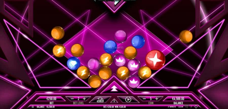 Techno Tumble позаимствовал дизайн у онлайн-игры в пинбол, но при этом добавил умный научно-фантастический штрих.. Установить внутри космического корабля, символы, как правило, представляют собой разноцветные светящиеся шары (фиолетовый, зеленый, синий, лайм, и фиолетовый) которые падают на дно для отображения и образуют кластеры. Вы можете обеспечить между 15 и 45 шары одновременно. При условии, что равноценные типы шаров соприкасаются, тебе могут заплатить. Очевидно, большие знаки, которые могут быть связаны с абсолютной комбо, тем больше бонусов вы получите. Минимальный диапазон, соответствующий соединенным знакам, необходимый для выигрыша, составляет 5.