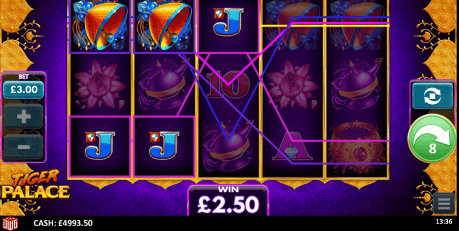 Tiger Palace — игровой автомат от Design Works Gaming, ориентированный на тигров.. Общее возвращение к игроку с мячом 96.21%. Ставки на игру начинаются с 0.30 за спин. Максимальная ставка на игру составляет 180 за спин.. The 5 * 3 слот имеет 25 ставки. Основные функции онлайн-игр, как правило,: Бесплатные спины, отклоненный, Дикие и прогрессивные джекпоты.
