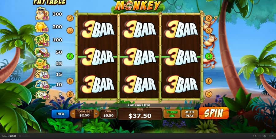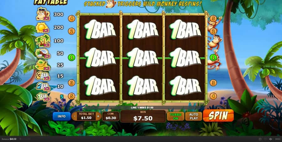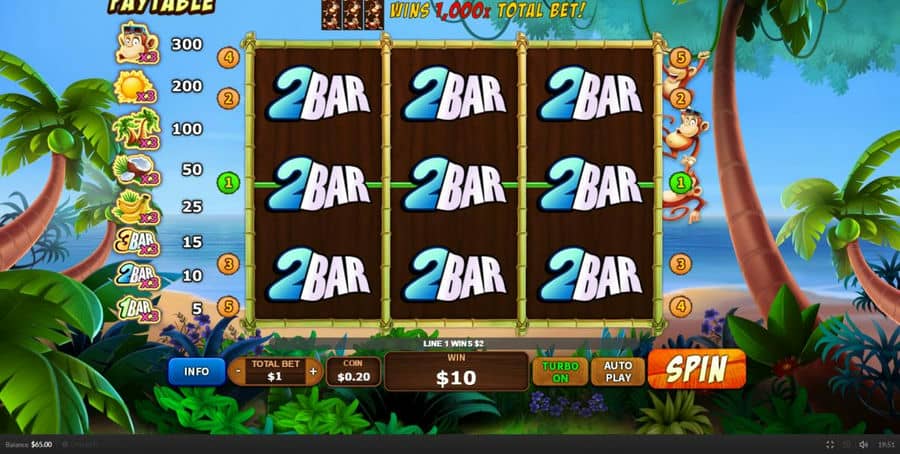 Прогуляйтесь по тропическому раю с помощью крутой «Тройной обезьяны»., винтажный 3-х барабанный, 5-линейный слот! Будьте осторожны с сложенными обезьянами, пока они становятся джокерами, пока барабаны будут вращаться, и вскоре вы получите выигрыш! Получать 3 барабаны, покрытые обезьянами, чтобы выиграть наибольшую награду в 1000 раз больше общей ставки!