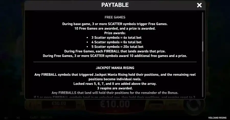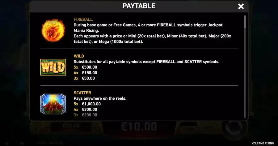 Видео-слот «Вулкан, увеличивающийся» от Ruby Enjoy побуждает вас обязательно ощутить острые ощущения от пребывания на территории рядом с извергающимся вулканом.. Этот 5-ти барабанный, 4-ряд, 50-слот диапазона выплат упакован с предпочтительными функциями. 4 или даже больше символов FIREBALL запускают увеличение джекпот-мании. В этой функции, люди могут выиграть один из четырех видов джекпотов с максимальным множителем до 1000 за акцию. Три или более знака разброса запускают бесплатные игры, в которых огненные шары дают отдельные выигрыши.. В этот слот играют в двух игровых настройках.: за реальные деньги или цифровые деньги (Демонстрационный режим).