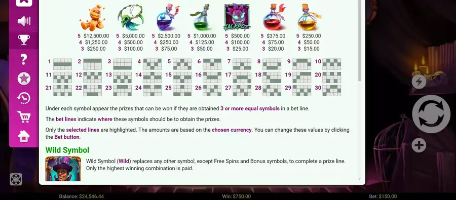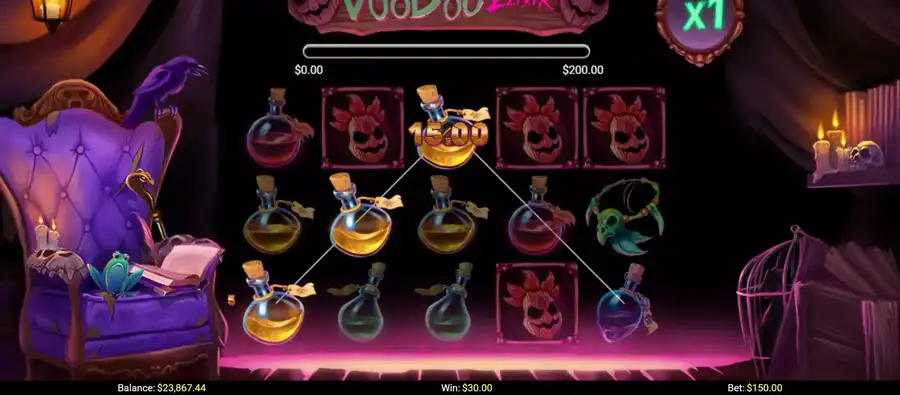 Эликсир вуду имеет 5 катушки, 3 ряды, и 30 выигрышные линии. Ставки делаются перед каждым спином. Диапазон ставок от $0.05 к $150 за спин и максимальный выигрыш 2500 раз ваша доля.