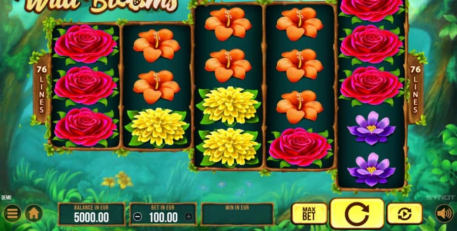 SYNOT — одна из ведущих студий в Центральной Европе., и что нам нравится во всех них, так это то, что они могут создавать слоты, которые находятся на одном уровне, несмотря на игры от многих самых лучших компаний на рынке.. Потому что, мы рады, что теперь можем рассказать вам больше о слоте Wild Bloom, который SYNOT запустил в 2020 и у этого есть некоторые интересные качества. Его игровое поле, для начинающих, довольно неортодоксально использует его 3-3-4-4-5 макет, который предлагает в общей сложности 76 ставки.