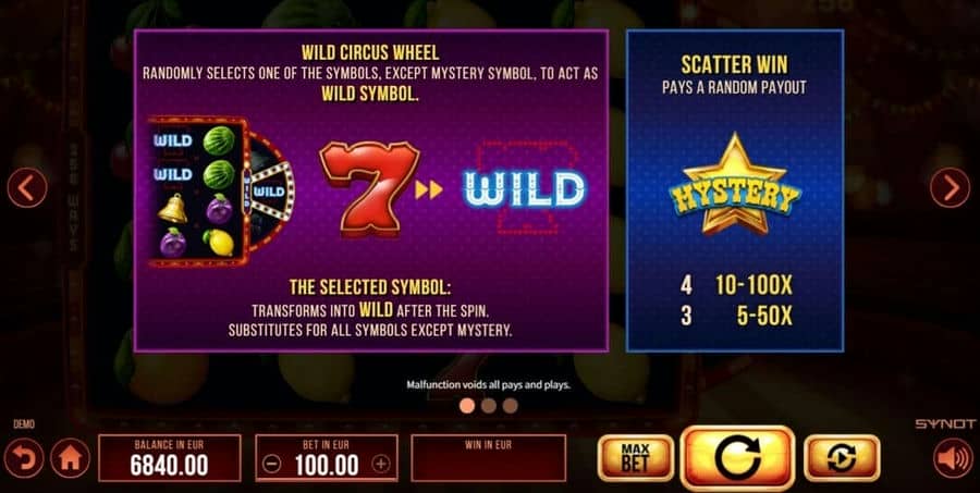 Возможно, вы слышали? Цирк едет в город! Получите удовольствие от фруктового зрелища с высокой прибылью с оригинальной функцией Wild Circus Reel и 256 подходы к победе. Цирковое колесо вращается одновременно с использованием барабанов, и случайный символ выбирается для изображения логотипа Wild.. Все появления этих символов на барабанах затем превращаются в джокеры..