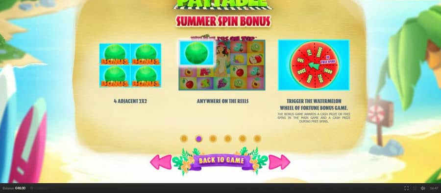 Бонусная онлайн-игра доступна в том случае, если вы сможете собрать 4 бонусные знаки. Арбузное колесо с большими деньгами ждет вас в бонусной онлайн-игре. Вращая это колесо, вы можете выиграть денежные призы и бесплатные вращения..