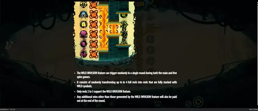 С этой решающей битвой за мир, людям помогают сумасшедшие функции Invasion, абсолютно бесплатные спины, и специальные колоссальные знаки. Игровые знаки можно было складывать и образовывать одну Колоссальную символику, занимающую от 2 к 6 регулярные возможности. Crazy Invasion — это случайная функция, которая способствует выигрышу ежедневного прогрессивного джекпота..