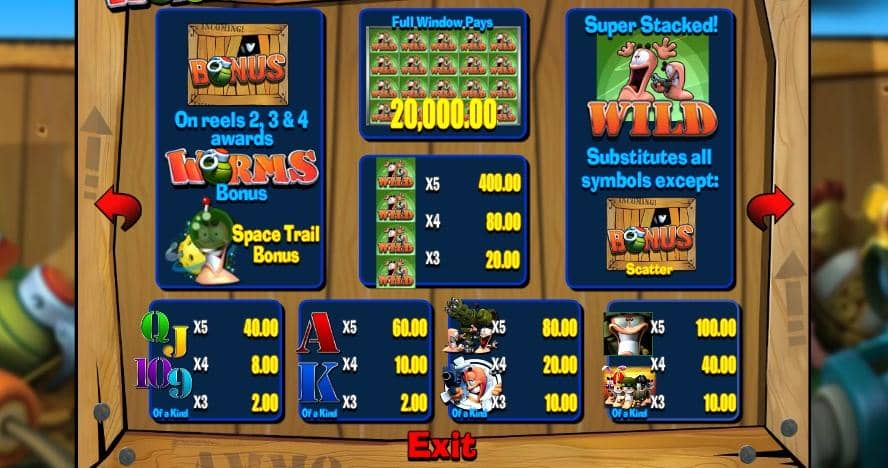 Внешний вид слота будет очень знаком каждому, кто играл в видеоигру., имя ищет просто так видеоигру, с помощью фирменной ручной гранаты, развивающей страницу «О» червей. На заднем фоне вашего слота видны черви и боеприпасы, десантируемые с парашютом., хотя на барабанах изображены черви в различных боевых позах, в том числе прицельное оружие, держит людей и ищет спрятанные в деревянных контейнерах (может ли червь в боевой экипировке спрятаться в деревянном пакете). Каждое вращение сопровождается действительно подходящей боевой звукозаписью., дополнение к теме этого слота.